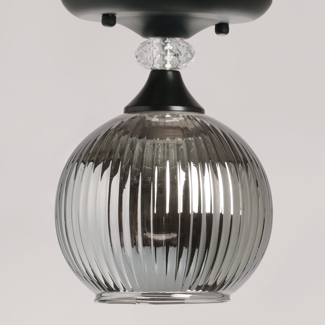 Металлическое основание светильника окрашено в черный цвет. Стеклянный плафон отлит в сложную форму и гальванизирован в дымчатый цвет. У основания светильник декорирован прозрачным хрусталем.