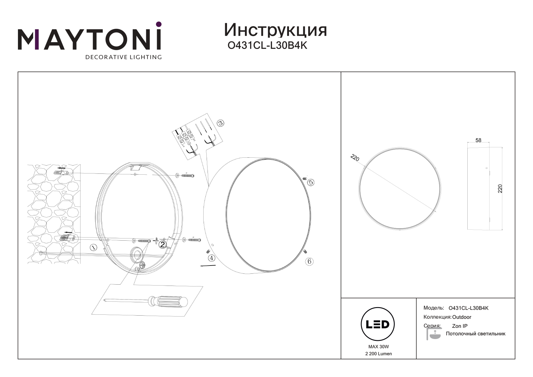 Мощность связана с величиной светового потока люмен (Lm), и от неё зависит яркостью лампы. - Общая мощность: 30 W