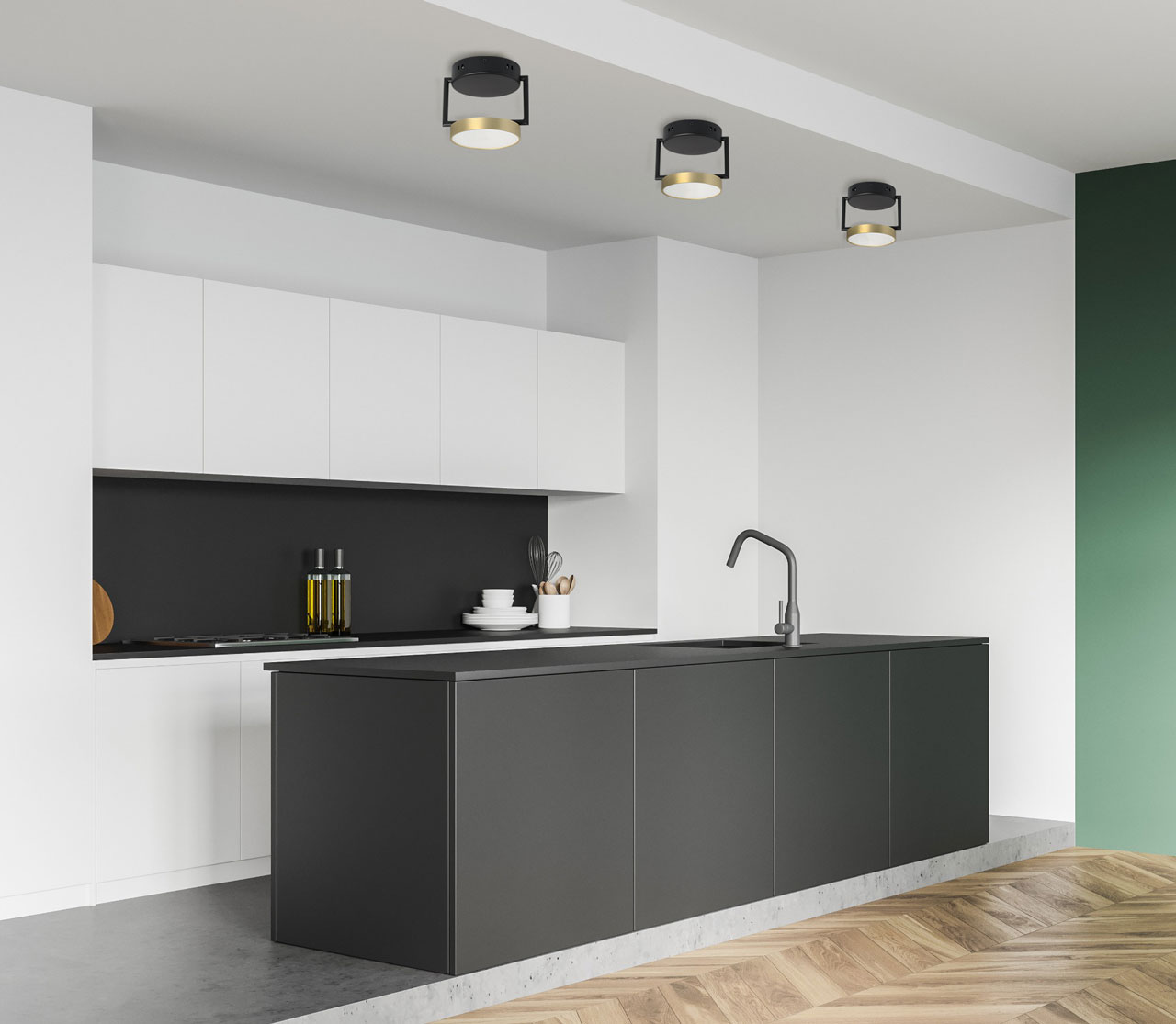 Металлическое основание потолочного светильника обработано по технологии порошкового окрашивания в черный цвет. Корпус плафона гальванизирован в цвет золота. Светодиодные источники света закрыты белым матовым акрилом.