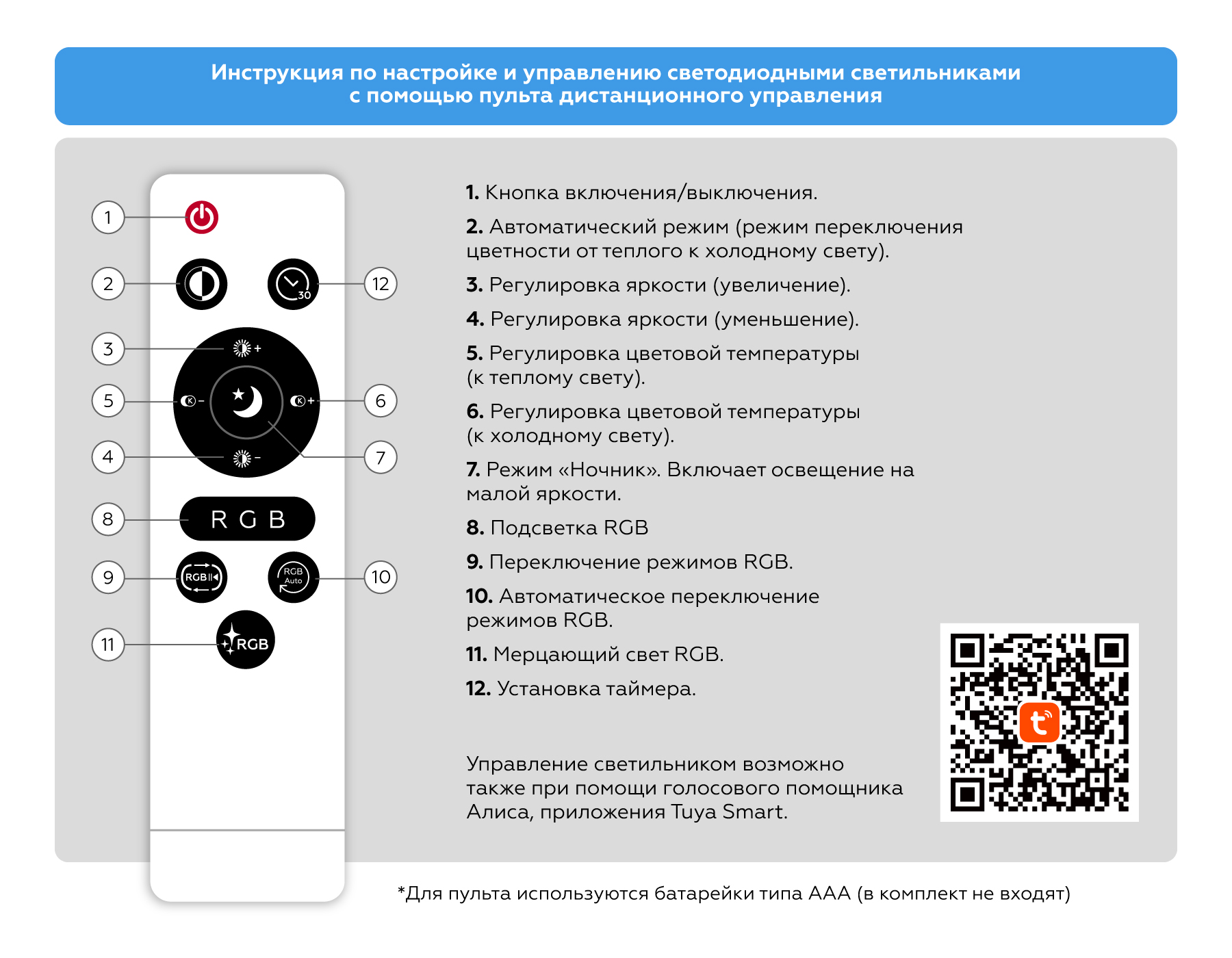 - Количество рожков: диммирование, изменение цветовой температуры, ночной режим, таймер, режим памяти