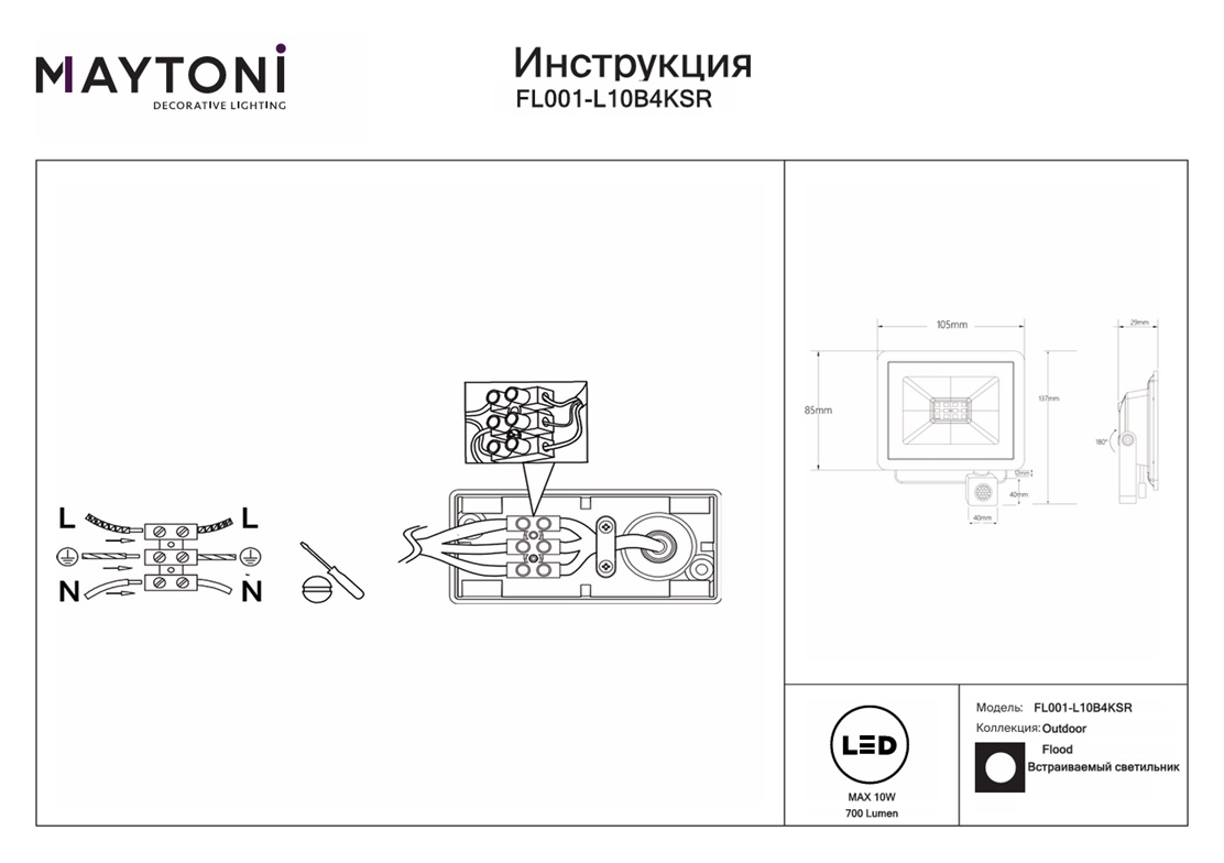 Прожектор Maytoni Flood FL001-L10B4KSR 4000K IP65 — это модель садово-парковых прожекторов для освещения экстерьеров, рабочих пространств, производственных и промышленных помещений, которая имеет высокую степень защиты IP65, подходящую для использования как на улице, так и внутри помещения. Благодаря источнику света с типом цоколя LED, мощности 10 Вт и цветовой температуре 4000 К, этот осветительный прибор обеспечивает комфортное и равномерное освещение на площади в 2 квадратных метра, создавая уютную атмосферу в вашем придомовом пространстве. Световой поток равен 700 Лм. Алюминиевая арматура, окрашенная в черный цвет, подчеркивает, словно рамка, строгие линии прозрачного плафона в форме прямоугольника. Артикул имеет пять размеров с соответствующими вариантами мощности — 10, 30, 50 Вт с датчиком движения и модели 100 и 150 Вт без датчиков движения. Размеры устройства составляют 29 мм х 137 мм, что позволяет легко интегрировать его в любое пространство. Модели, входящие в коллекцию Flood FL001, идеально подойдут для размещения в зоне фасада, входной группы, сада, террасы, веранды, оформленных в современном стиле, а также в любой части придомовой территории, позволяя использовать один или несколько источников света для освещения длинных участков и обширных пространств. Прожектор Maytoni Flood FL001-L10B4KSR 4000K IP65 — это надёжный и долговечный осветительный прибор, который прослужит вам долгие годы, а благодаря использованию LED технологий, позволит бережно расходовать электричество. Производитель Maytoni дает гарантию на свои товары. Данную модель FL001-L10B4KSR спешите купить в интернет-магазине 220svet.