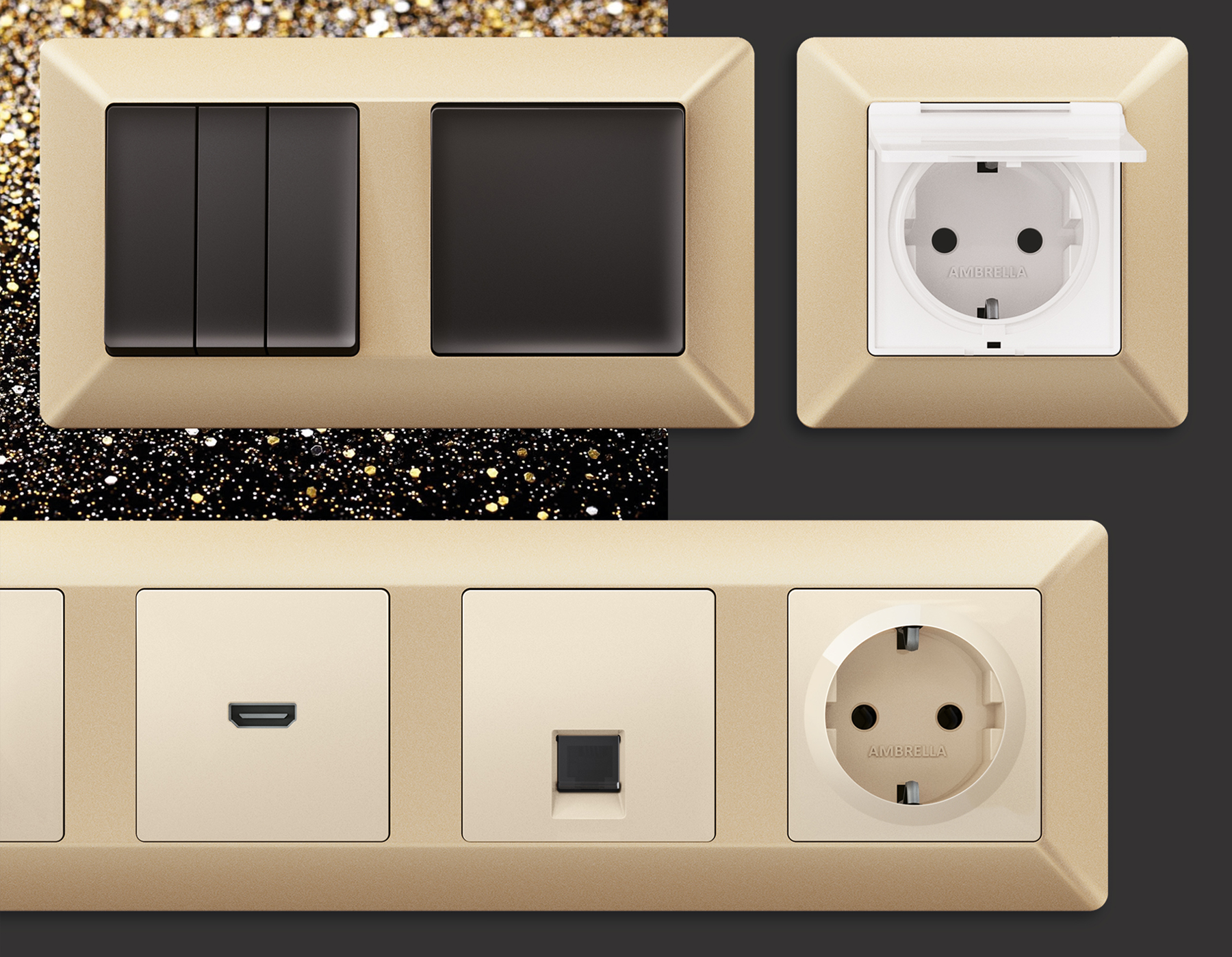 Многогранный ассортимент Ambrella Volt включает в себя механизмы, лицевые панели и рамки, а также комплекты, доступные в различных цветовых решениях. Продукция представлена в модульном исполнении, что позволяет гибко настраивать внешнийвид и функциональность. Вам будет легко заменить лицевую панель, рамку или механизм, найдя идеальное сочетание цветов.