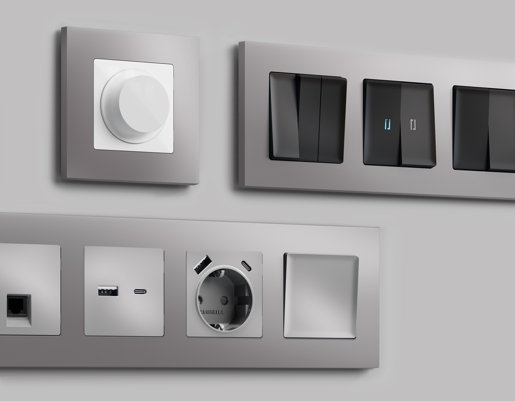 Многогранный ассортимент Ambrella Volt включает в себя механизмы, лицевые панели и рамки, а также комплекты, доступные в различных цветовых решениях. Продукция представлена в модульном исполнении, что позволяет гибко настраивать внешнийвид и функциональность. Вам будет легко заменить лицевую панель, рамку или механизм, найдя идеальное сочетание цветов.