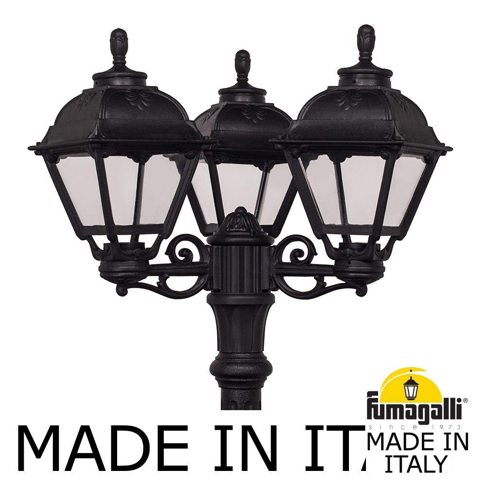 Садово-парковый фонарь FUMAGALLI серии CEFA, модель CEFA/GIGI/BISSO 3L. Парковый торшер, столб GIGI с тремя уличными фонарями CEFA на малых консоля BISSO. Используются для архитектурного и ландшафтного освещения в стиле "классика". Место установки столбиков освещения - парковые дорожки, cкверы, садовые участки, тротуары, а так же ландшафтные и архитектурные объекты. Изготовлены в Италии, по уникальным технологиям "FUMAGALLI" из современного композитного полимера RESIN. Этот материал в 5 раз прочнее металла, не ржавеет, не окисляется, не выгорает на солнце, его не нужно красить. Все светильники пыле-влаго защищены по стандарту IP55 (Пылезащищенные, защита от водяных струй с любого направления). В комплекте идут крепежи и закладные элементы. Рассеиватель выполнен из антивандального, не мутнеющего и не горючего PMMA (ПолиМетилМетаАкрилат). Срок службы светильника - не менее 20 лет. Температура использования от -60 до +90. В серии CEFA есть фонари в настенном (BISSO/CEFA, OFIR/CEFA, MIRRA/CEFA, PORPORA/CEFA) подвесном (SICHEM/CEFA) и наземном исполнении (MINILOT/CEFA, MIZAR.R/CEFA, IAFAET.R/CEFA, ALOE.R/CEFA, ARTU/CEFA, GIGI/CEFA, RICU/CEFA, RICU/ISSO/CEFA 2L, NEBO/CEFA, NEBO OFIR/CEFA 2L, NEBO OFIR/CEFA 3L) со столбами разной высоты, с разным количеством и конфигурацией голов. Консоли настенных фонарей и кронштейны светильников на столбах освщения могут устанавливаться вверх/вниз. Столбы выше 150 см имеют в основе мощную стальную трубу с двойной оцинковкой. При заказе требуется выбрать цвет корпуса, цвет плафона и тип патрона. По стилю и дизайну серия уличных светильников CEFA похожа на светильники большого размера SIMON и на светильники очень большого размера (Гранд) PIETRO. По размеру CEFA относится к средним светильникам как серия RUT, SALEM и GLOBE 300.