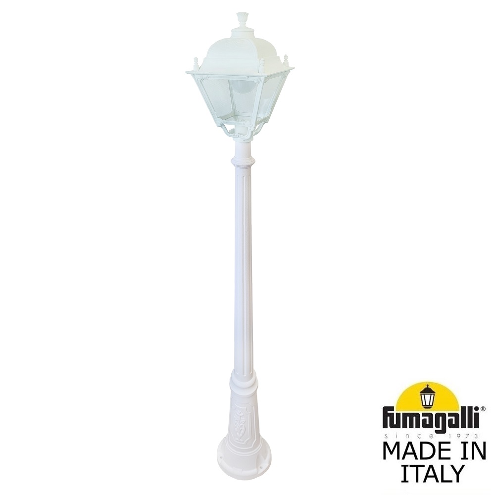 Садово-парковый фонарь FUMAGALLI среднего размера серии SIMON, модель RICU/SIMON. Парковый фонарь с 1 венчающим светильником большого размера в на классическом столбе RICU высотой 2,0 м (+высота фонаря). Предназначен для освещения парковых дорожек, cкверов, садовых и ландшафтных композиций, и других общественных пространств. Используется в качестве основного уличного освещения на городских улицах и площадях. Изготовлены в Италии, по уникальным технологиям "FUMATECH" из современного композитного полимера RESIN. Этот материал в 5 раз прочнее металла, не ржавеет, не окисляется, не выгорает на солнце, его не нужно красить. Все светильники пыле-влаго защищены по стандарту IP55 (Пылезащищенные, защита от водяных струй с любого направления). Рассеиватель выполнен из антивандального, не мутнеющего и не горючего PMMA (ПолиМетилМетаАкрилат). Срок службы светильника - не менее 20 лет. Температура использования от -60 до +90. В серии SIMON есть садовые фонари в настенном (OFIR/SIMON, MIRRA/SIMON) подвесном (SICHEM/SIMON) и наземном исполнении (IAFAET.R/SIMON, ALOE.R/SIMON, ARTU/SIMON, GIGI/SIMON, RICU/SIMON, NEBO/OFIR/SIMON 1L, NEBO/OFIR/SIMON 2L, TABOR/ADAM/SIMON 3L) со столбами разной высоты, с разным количеством и конфигурацией голов. Консоли настенных фонарей и кронштейны светильников на столбах освещения могут устанавливаться в положение вверх и вниз. Столбы выше 150 см имеют в основе мощную стальную трубу с двойной оцинковкой. При заказе требуется выбрать цвет корпуса, цвет плафона и тип патрона (Е-27 или LED GX-53). Возможен светодиодный вариант. По стилю и дизайну серия уличных светильников SIMON похожа на светильники среднего размера серии CEFA. По размеру относится к большим парковым светильникам как серия NOEMI и GLOBE 400.