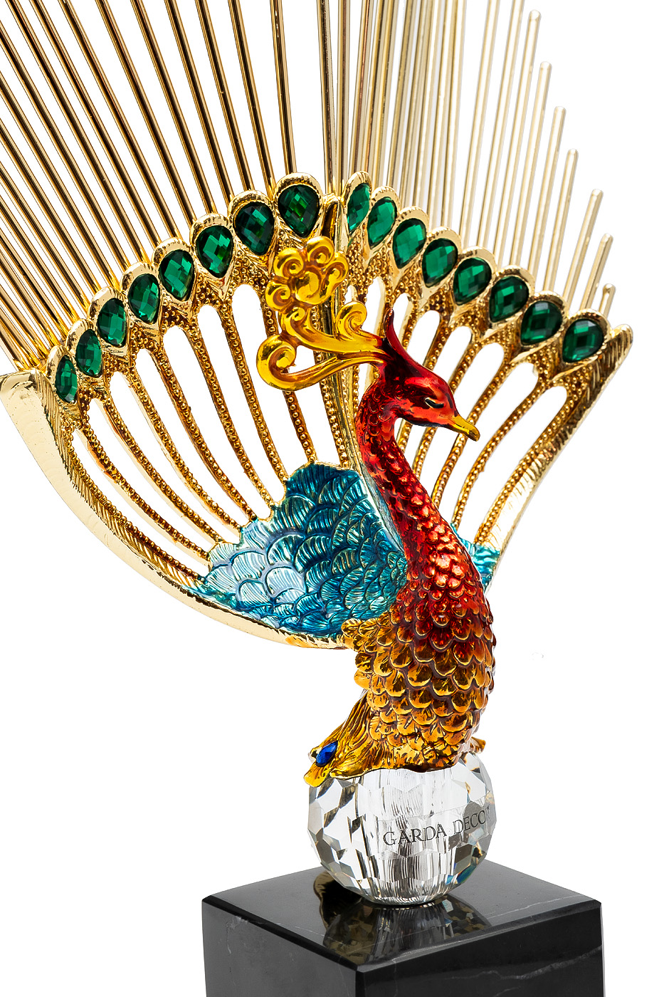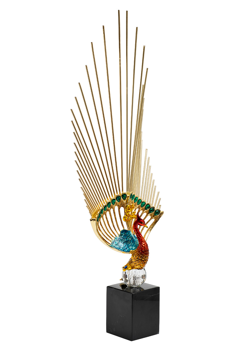 Яркая и грациозная, статуэтка жар-птицы в стиле ар-деко — это скульптурный образ утонченной декоративности. Имитация силуэта, изящные линии и насыщенная палитра оттенков создают ощущение эпичности и театральности. Легкость металла и сияние эмалированных деталей гармонично сочетаются с геометрией черного мраморного постамента, подчеркивая характерные черты эпохи ар-деко. Этот акцентный арт-объект станет выразительным украшением интерьеров с тягой к эстетике роскоши и символизма.