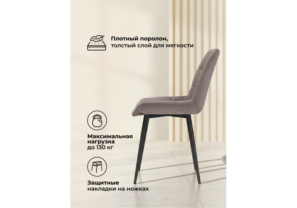 Материал каркаса - металл; Материал сиденья - велюр; Материал обивки - велюр; Цвет ножек - черный; Ширина - 50; Глубина - 60; Высота - 80; Ширина сиденья - 44; Глубина сиденья - 41; Высота сиденья - 48;