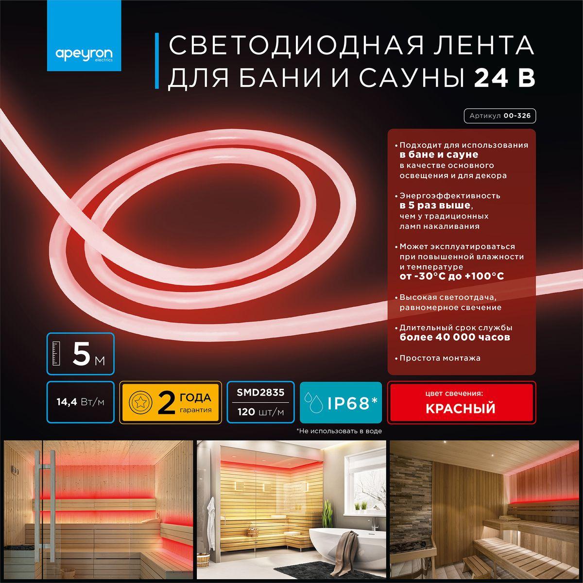 Купить "Влагозащищенная лента Apeyron 14,4W/m 120LED/m 2835SMD красный 5M 00-326"