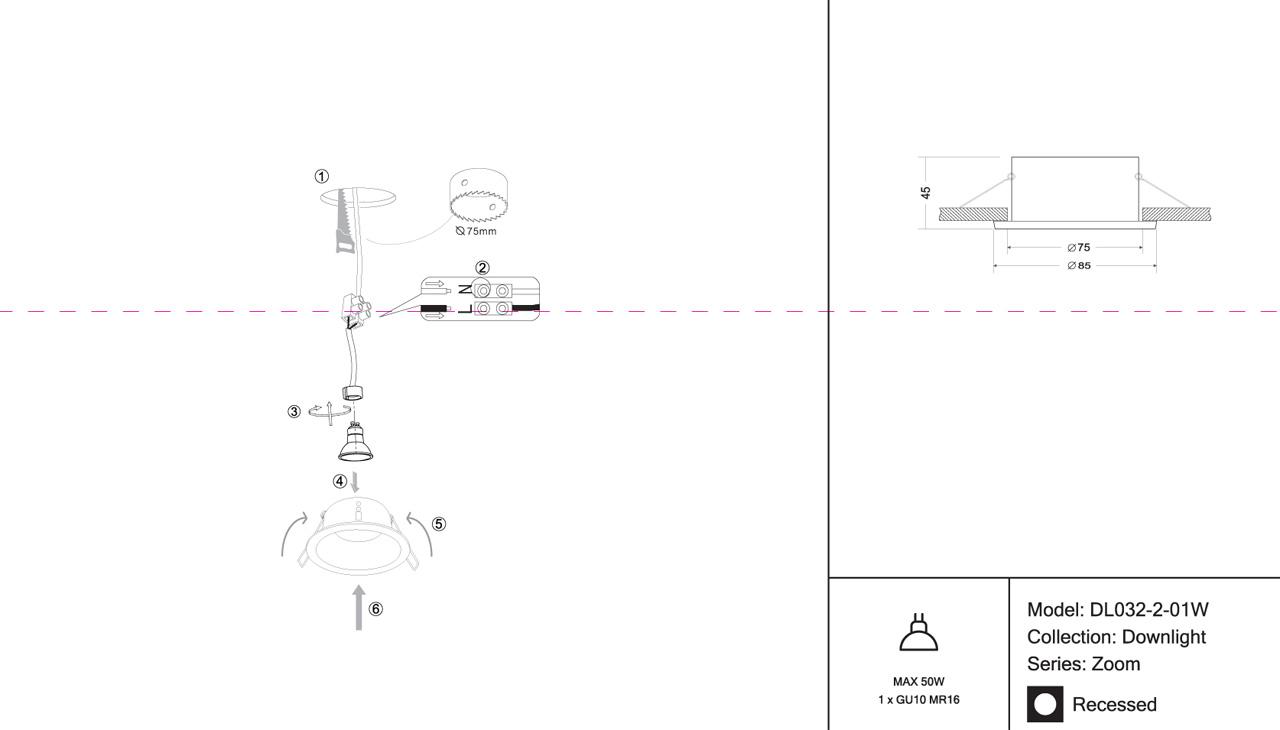 - Диаметр врезного отверстия: 75 мм (7.5 см)